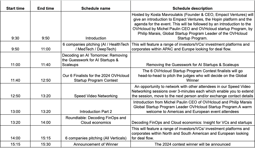 After the success of our 2023 events, we are running another global virtual Showcase in 2024. This event will feature Live Pitches and Demos, an Expo, Speed Video Networking, Roundtable Discussions, and the annual OVHcloud Startup Program Showcase Contest final.
